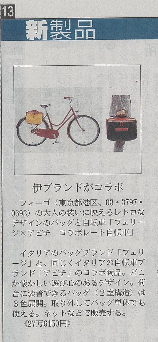 目次のすぐ後の「edeitor's view ニュースなモノ語り。」のページで、大きく一面、ABICIとFelisiのコラボレートバイク&バッグをご紹介いただきました。